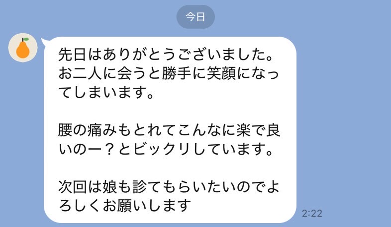背中全体が痛くなり、伺いました。 いつものことですが、その痛みの原因を見つけて根本から治してくれるので体全体が楽になります。 また、よろしくお願いします。