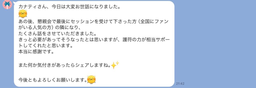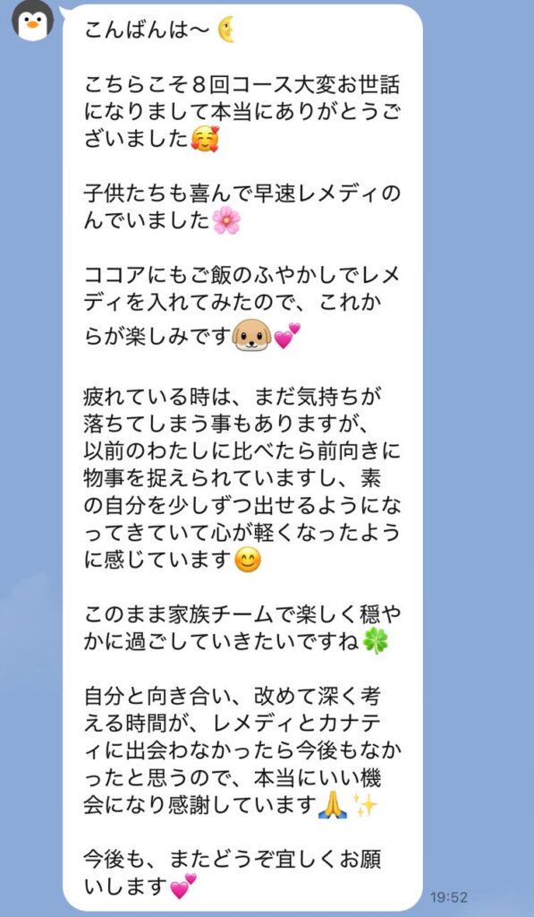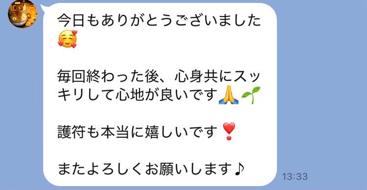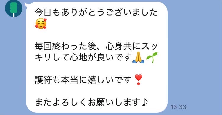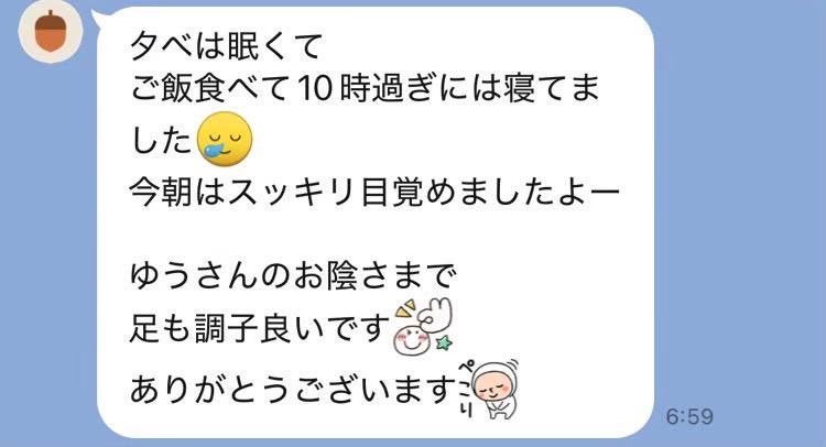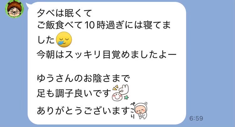 いつもありがとうございます。 毎回辛いところを親身に聞いてくれて丁寧にケアしてもらっています。 今回も体調回復してきました! オーダーメイド整体を受けた日はすごくぐっすり眠れます。 またよろしくお願いします。