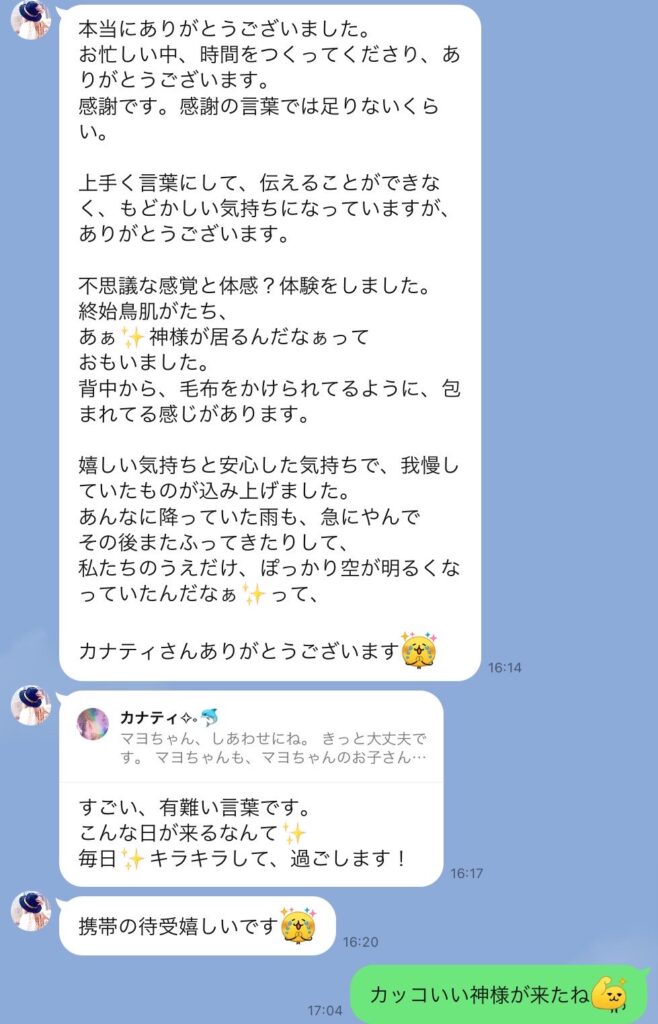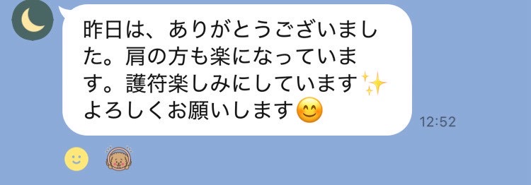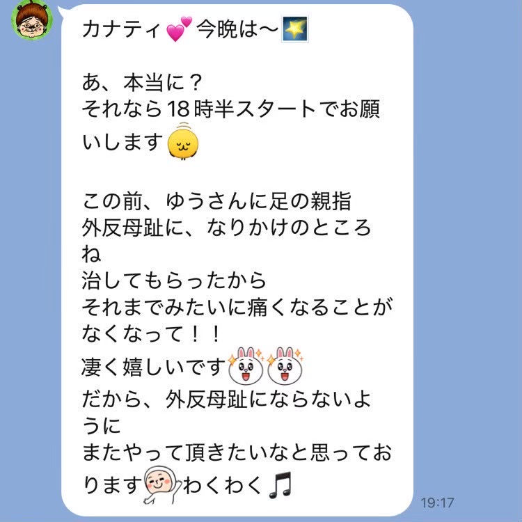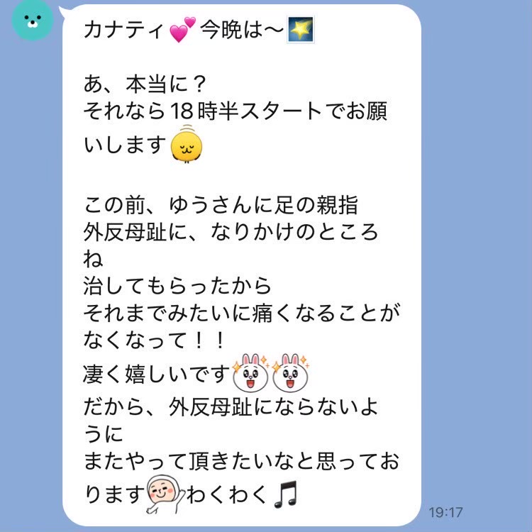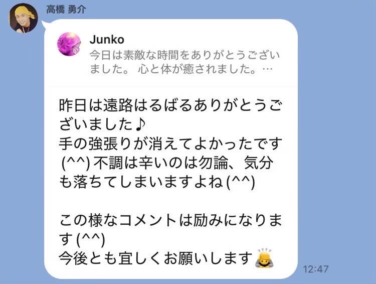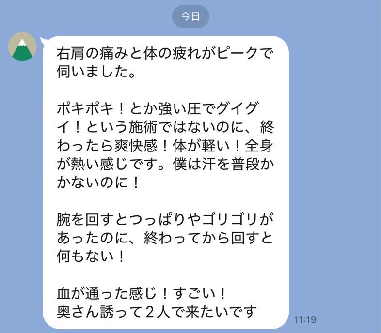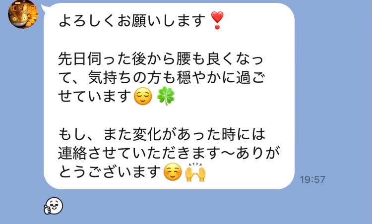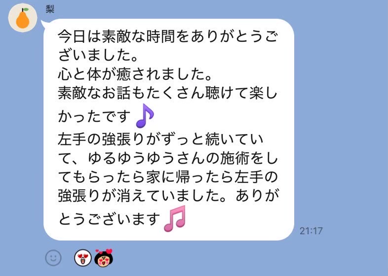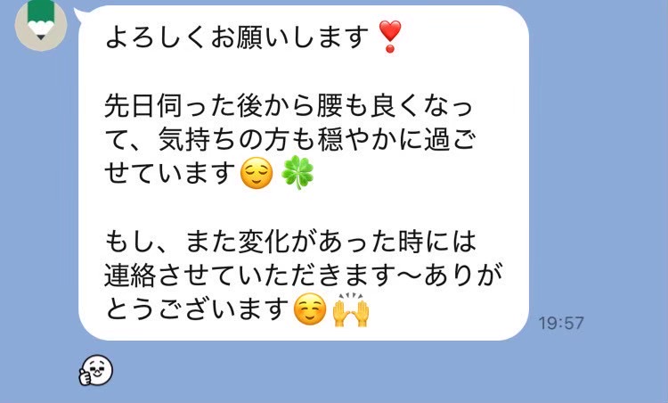 遅い時間にありがとうございました。 尾てい骨あたりの痛みが取れなくて暫く辛かったのですが、すっかりなくなりました! 右肩、腰、足の怠さや凝りも楽になりました。 施術中、詰まっていたところが通る感じがして効いてる~!ってなるのが個人的にはとっても好きです。 またよろしくお願いします!