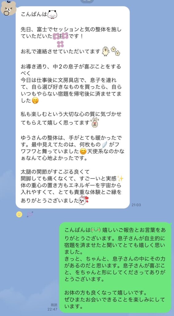 いつも息子がお世話になっています。施術していただいた後は本当に体が軽くなり満足して帰ってきます。また、そればかりでなく普段の体の使い方なども、丁寧な説明してくださるので、助けられています。今回もありがとうございました。良い状態で大会に挑めそうです。